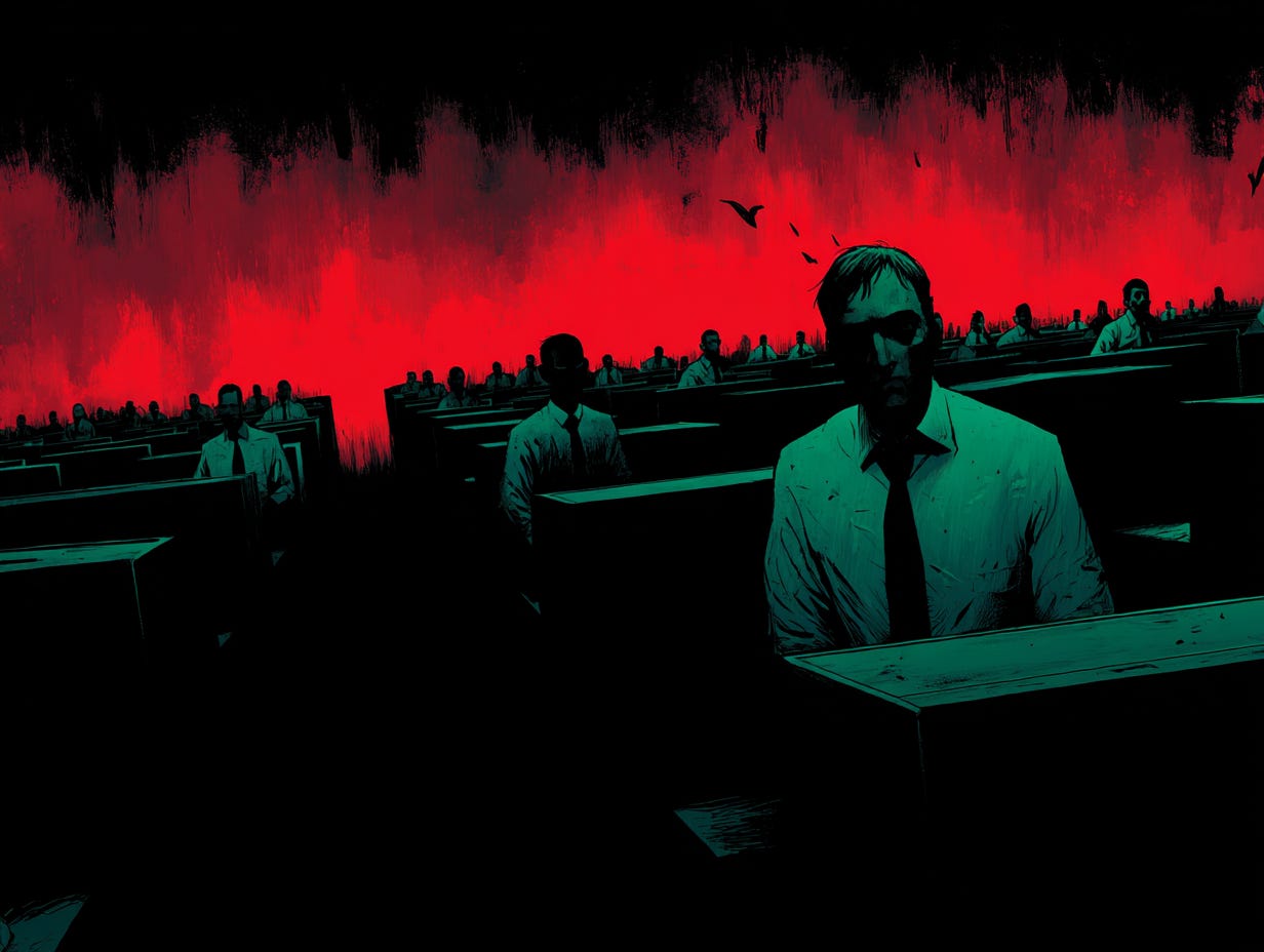 Our fear becomes a dull weight in the chest and calls itself fatigue. You cannot fight fatigue. You carry it to work, and you drag it home. You scroll through it until you fall asleep. It is not terror that lets evil win, but exhaustion. We let it consume us, because when we buried Grendel, we buried the part of us that would have hunted him. The man who would walk naked into the dark did not disappear. He was starved out and trained to look away. Told there was nothing there worth naming.